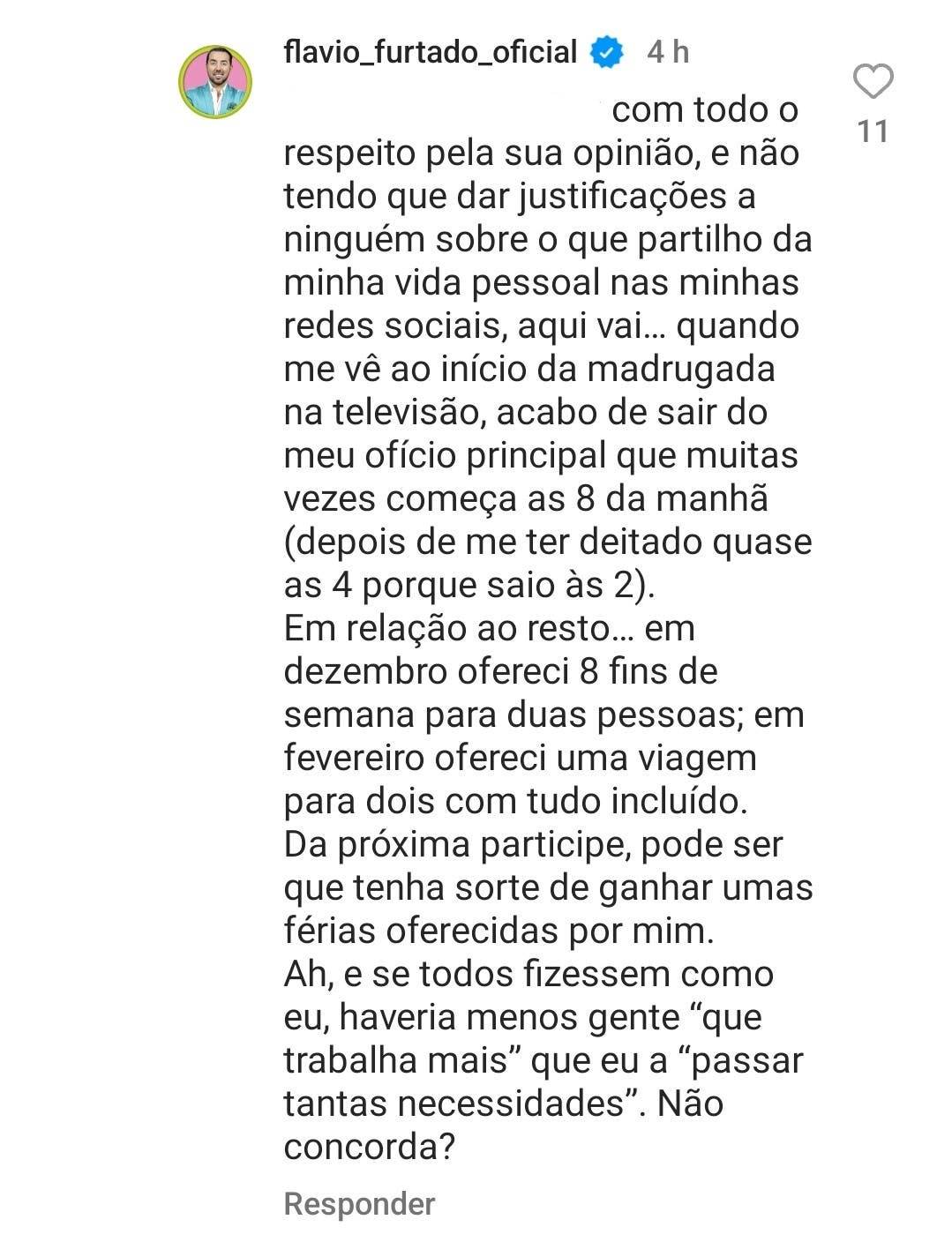 Apresentador de TV Flávio Furtado está de férias no Dubai antes de partir para as Seychelles. Ele compartilhou nas redes sociais fotos de sua visita ao Burj Khalifa, o maior prédio do mundo, onde chegou ao 154º andar. Em seguida, ele postou uma foto no Burj Al Arab Jumeirah, com a legenda "Aqui está um dos motivos pelos quais eu trabalho tanto: aproveitar a vida, colecionar momentos e ser feliz". Após compartilhar uma foto na praia, Flávio Furtado recebeu comentários de seguidores criticando sua ostentação. Ele respondeu dizendo que trabalha duro e também faz doações, e convida as pessoas a participarem para ter a chance de ganhar uma viagem oferecida por ele.