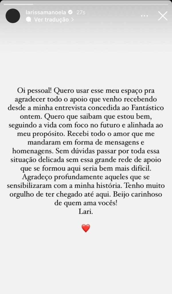 Após entrevista reveladora, Larissa Manoela agradece apoio em meio a situação delicada. A atriz utilizou suas redes sociais para expressar gratidão pelo apoio recebido após expor áudios e contratos sobre sua relação familiar.
