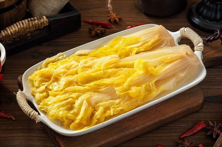 這其中用大白菜腌制的酸菜最普遍,顏色金黃,口感酥脆味道酸爽,有熟腌和生腌兩種方法,熟腌就將大白菜用熱水燙一下,然后入壇子澆上水密封腌制,這種方法速度快一點,大概30天就能吃,但是不易控制容易失敗。而生腌就是把大白菜里撒一點食鹽入壇,澆上水沒過白菜,再用重物壓著,腌制大約1個月時間就能吃了。